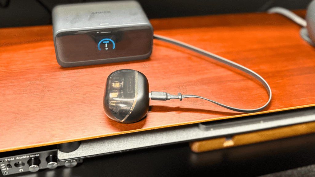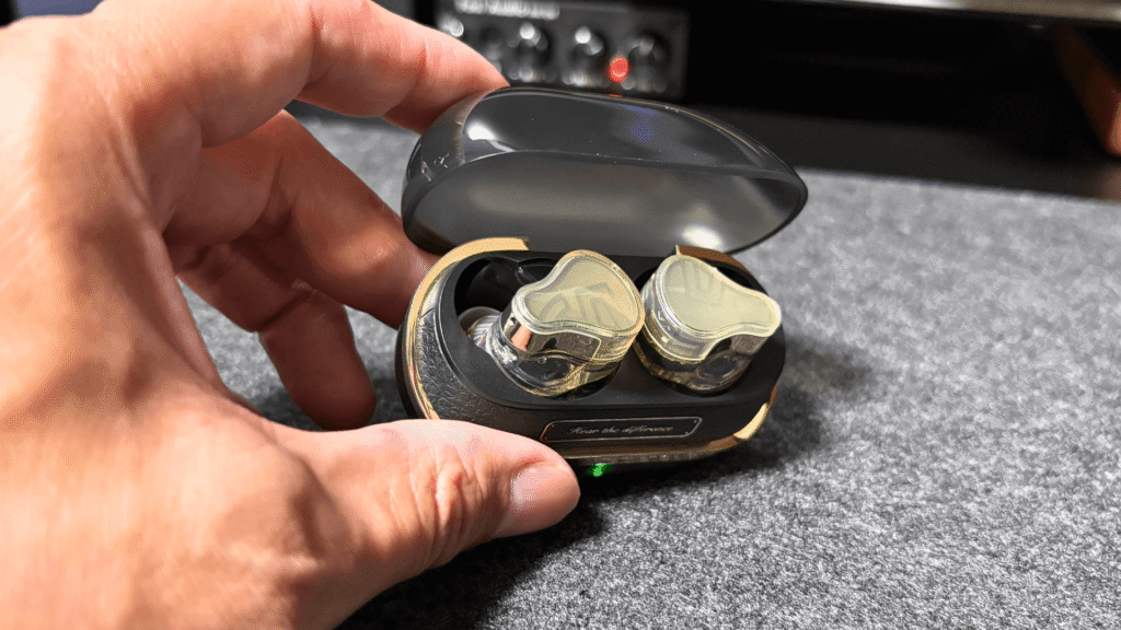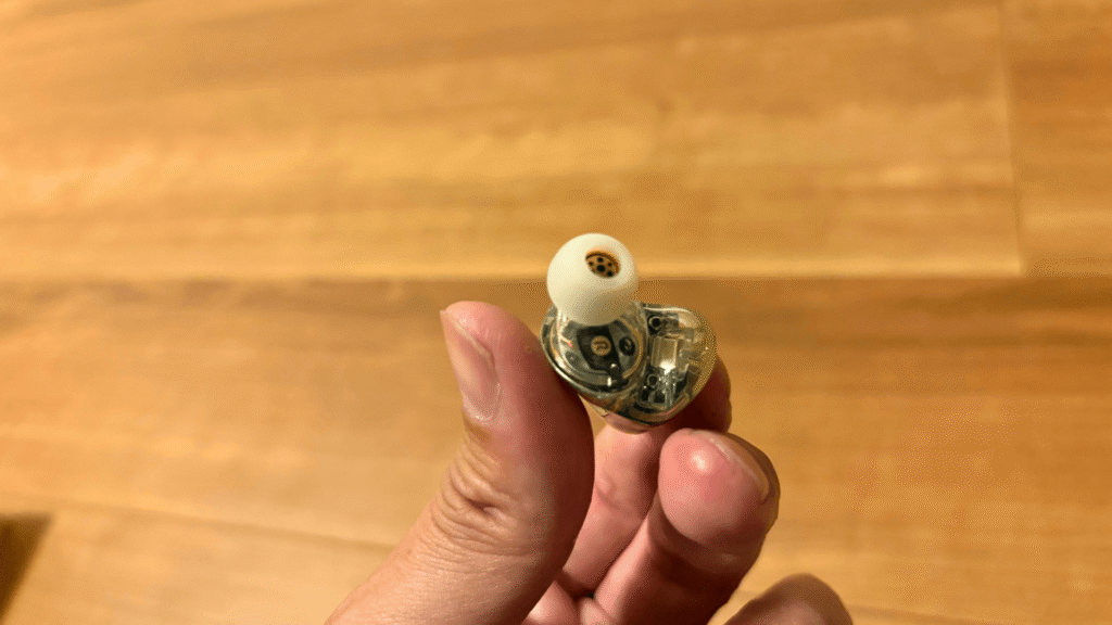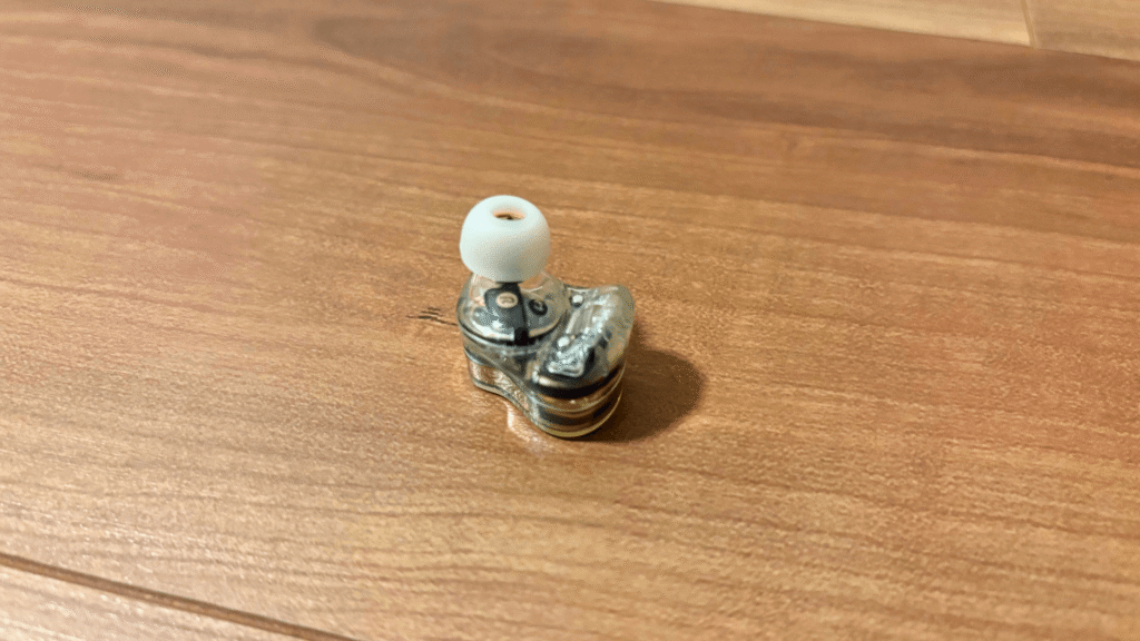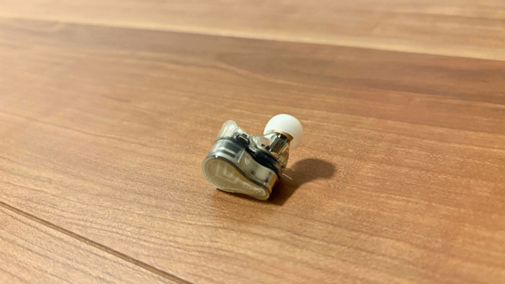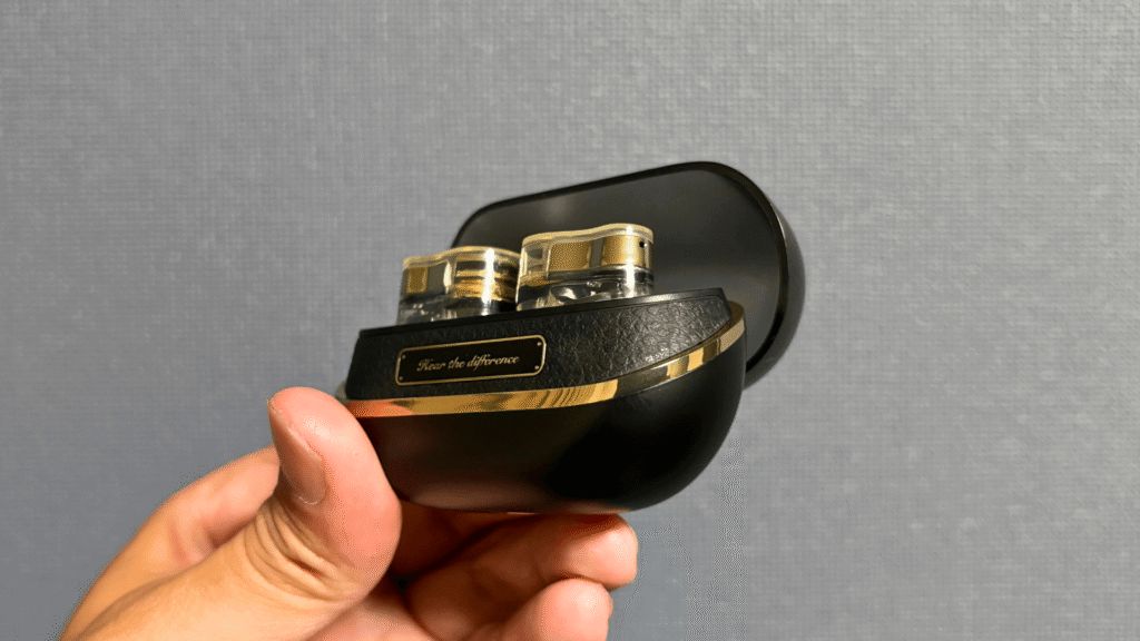 充電ケースは、手に取るとずっしりとした重みがあり、高級感が漂います。レザー調の質感とメタルプレートの組み合わせは、所有欲を満たしてくれるデザインです。ケースを開けると、クリスタル調の透明筐体を持つイヤホン本体が顔を出し、その美しさに思わず見とれてしまいます。開封の瞬間から、H3が特別な製品であることが伝わってきました。