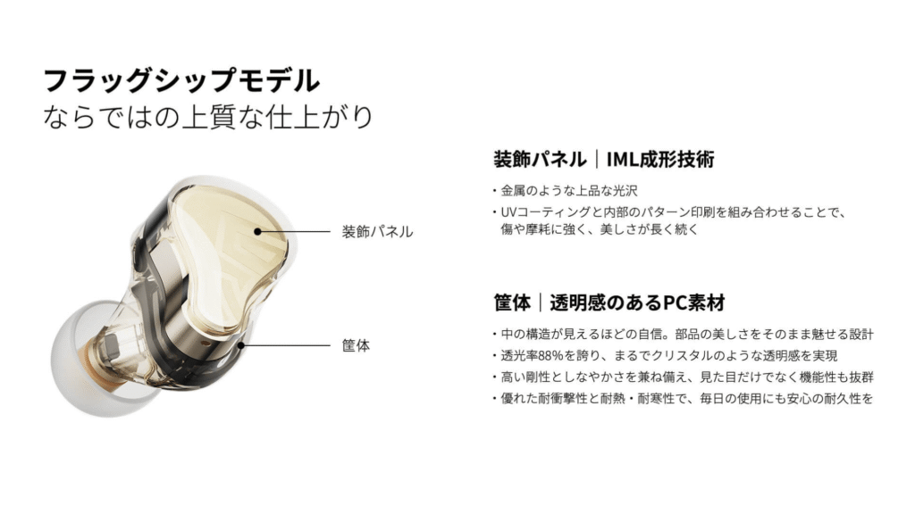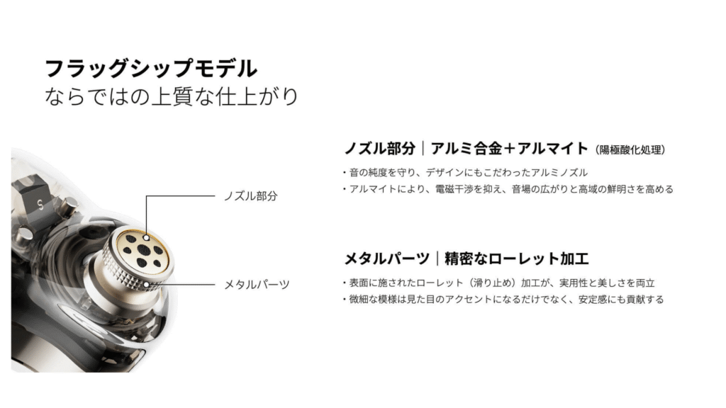 これらのデザイン要素は、H3が単なる「音を出す道具」ではなく、「所有する喜び」をもたらす製品であることを強く印象付けています。見た目の美しさだけでなく、音質や装着感といった機能性にも直結する、総合的に完成度の高いデザインです。