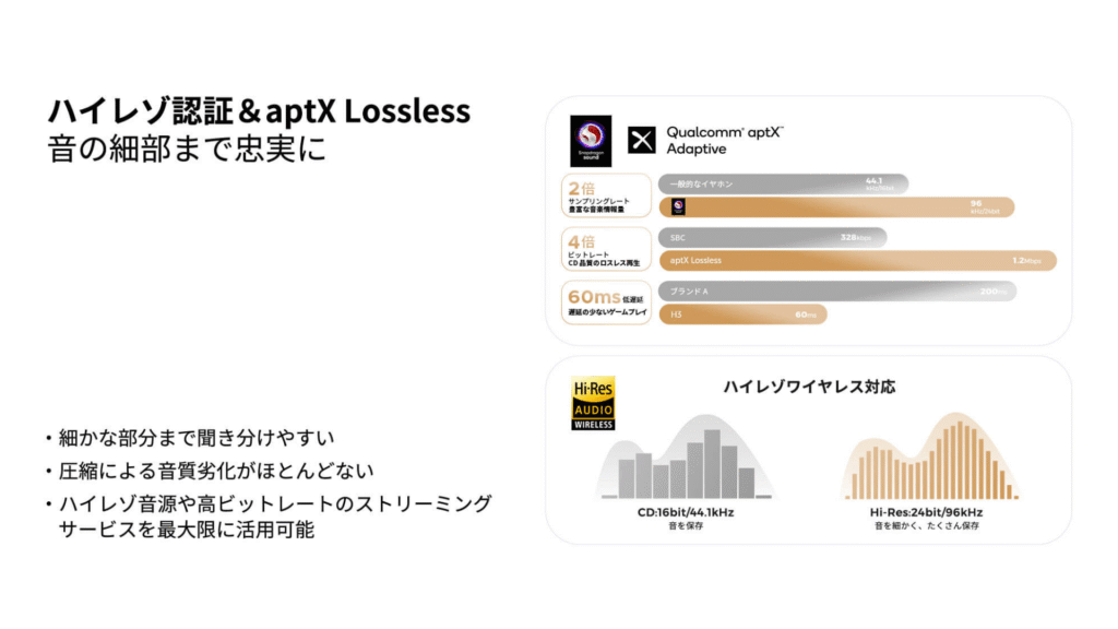 - aptX Lossless: Qualcommが開発した最新のロスレスコーデックです。最大1.2Mbpsに対応し、CD品質(16bit/44.1kHz)の音源を完全にロスレスで伝送します。これにより、有線接続のような劣化のないサウンドを実現します。