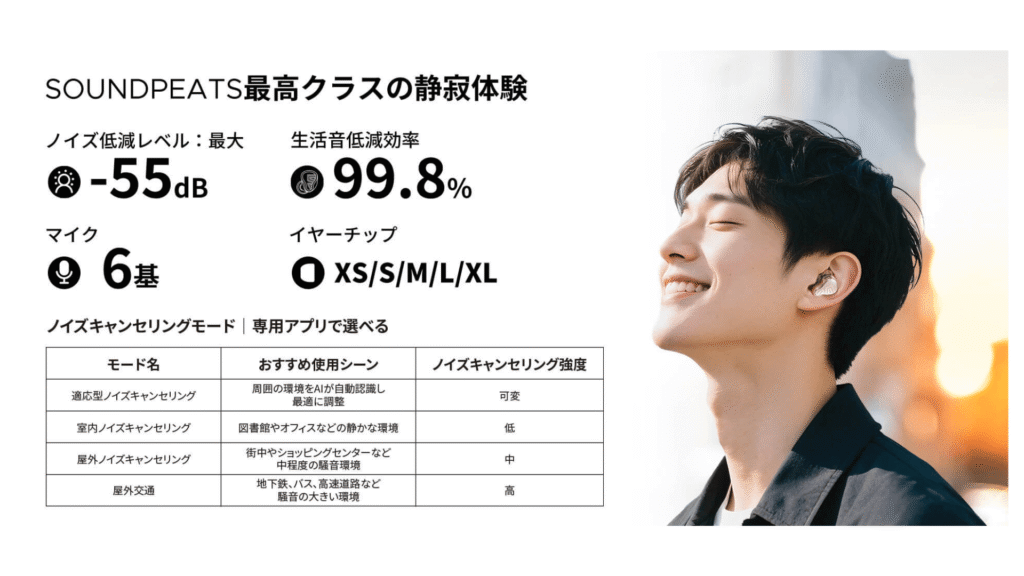 このように、SOUNDPEATS H3のAIアダプティブANCは、あらゆる環境でユーザーに最適な静寂を提供し、日々の生活の質を高める強力なツールとなるでしょう。