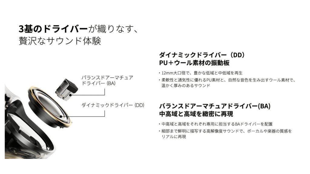 H3の音質は、ハイブリッドドライバー構成が核となっています。これは、12mmのダイナミックドライバー1基とバランスドアーマチュアドライバー(BAドライバー)2基を組み合わせたものです。この組み合わせは、それぞれのドライバーの長所を最大限に引き出し、質の高いサウンドを生み出します。