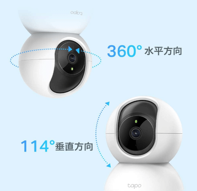 これがTapo C200最大の魅力です。アプリの十字キーで自在に操作でき、水平方向に360度、垂直方向に114度も首を振ります。天井近くに設置すれば、リビング全体を一つのカメラでくまなく見渡せる計算になります。プリセット位置を登録しておけば、玄関やペットのベッドなど、特定のスポットをワンタップで映すことも可能です。