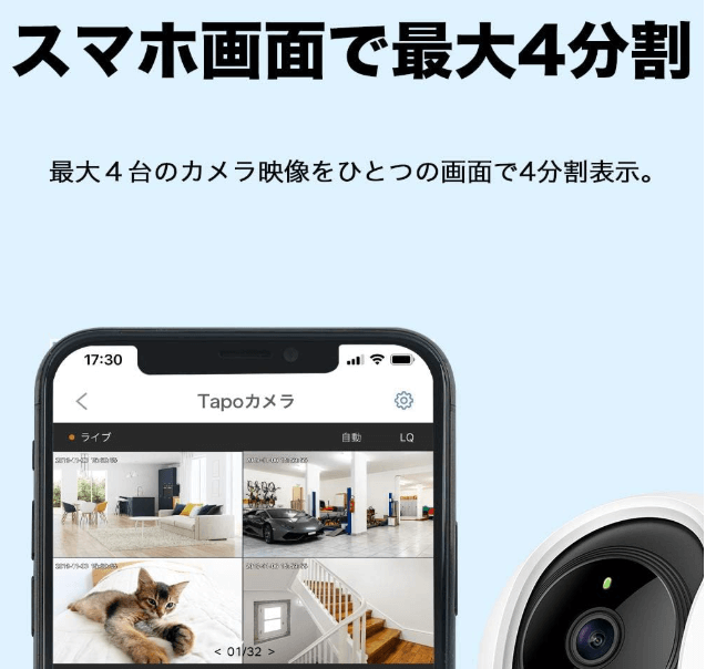 Tapoアプリは非常に評判が良いです。ライブ映像を見ながらカメラを操作し、設定を変えるという一連の流れがスムーズ。最大32台まで登録でき、4分割画面で同時に監視することもできます。複数台導入しても管理は容易でしょう。