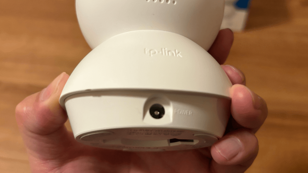 まず目を引くのはカメラ本体のデザインです。洗練されたドーム型で、どんな部屋のインテリアにもなじみます。レンズ部分は手でそっと上にスライドさせると開き、内部にmicroSDカードスロットとリセットボタンが隠れています。この設計は、カードの抜き差しには少し手間ですが、すっきりとした見た目を保てる利点があります。