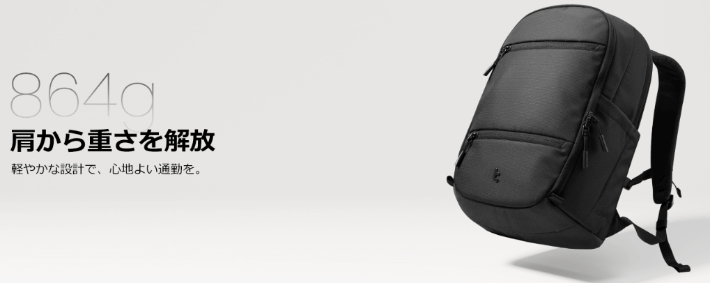このリュックは、都市生活に最適な軽量バックパックとして、わずか864gという軽さと、22Lの大容量を両立させたアイテム。通勤時の負担を軽減しながら、必要な物をすべて収納できる便利さを兼ね備えています。