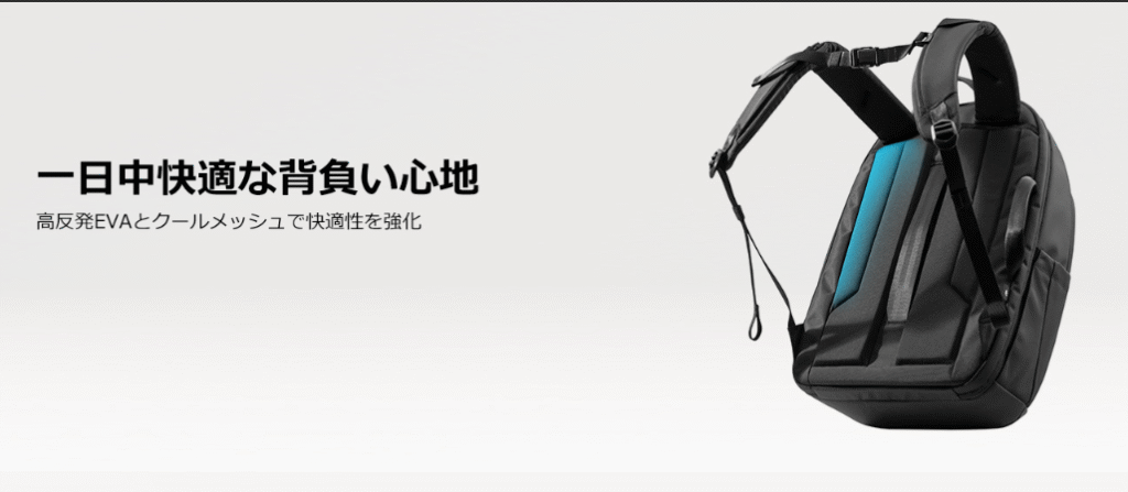 tomtoc T77の背負い心地は、軽量であることを活かした負担の少なさが特徴です。高反発EVAパッドとクールメッシュで背面とショルダーストラップを包み込むことで、蒸れを防ぎつつ快適さをキープできます。