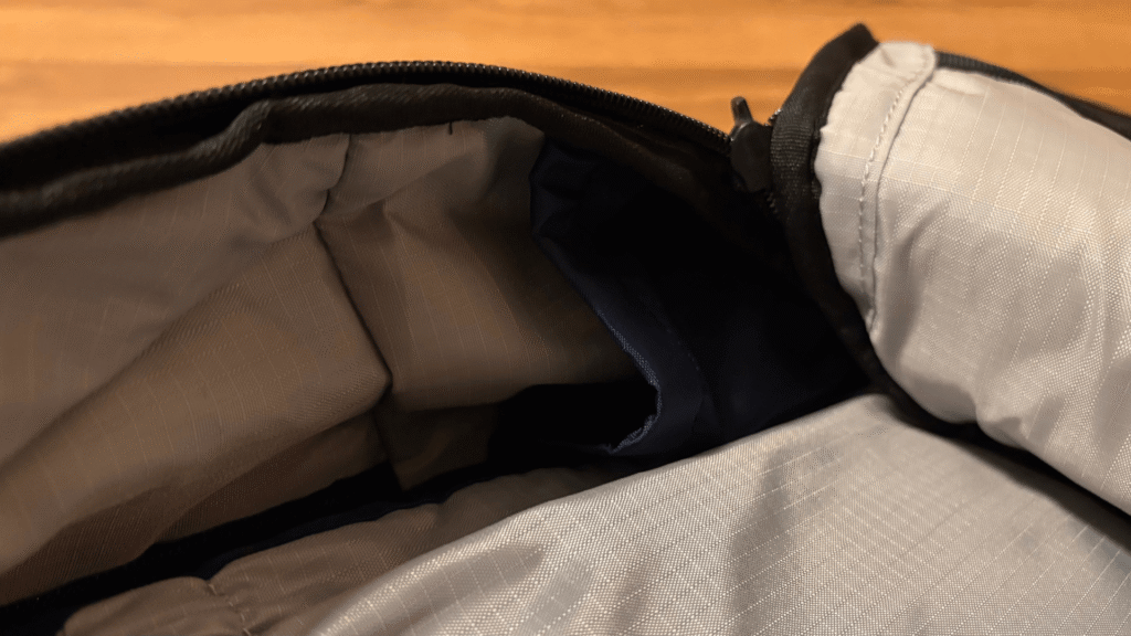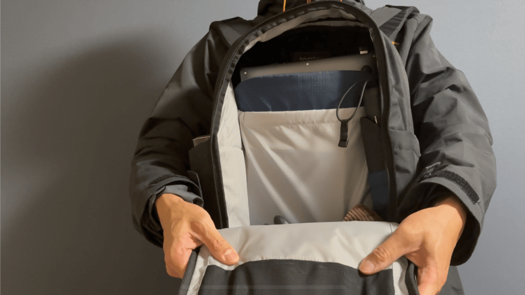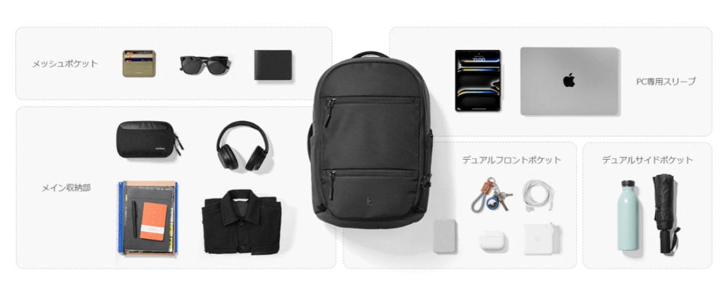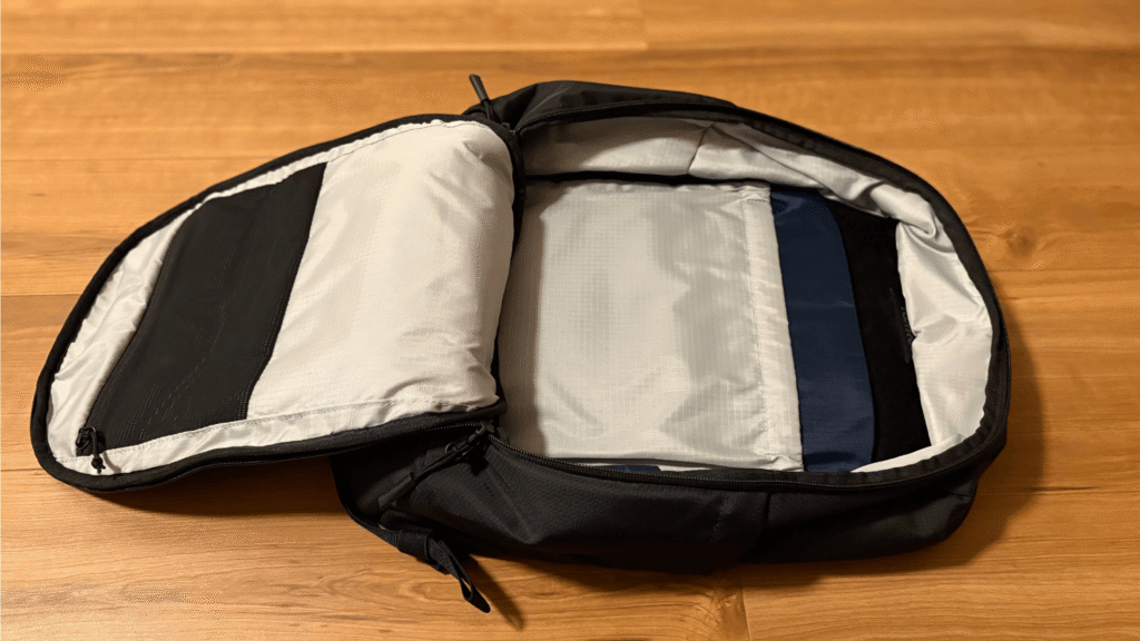 これらすべてを収納しても、まだ余裕があるほどです。特にメインコンパートメントは、180°フルオープンするクラムシェル構造となっており、中身が一目で確認できるため、荷物の整理がしやすい点が特徴です。