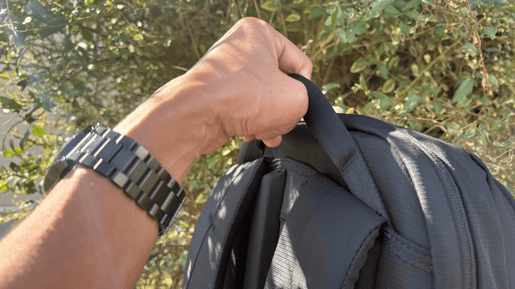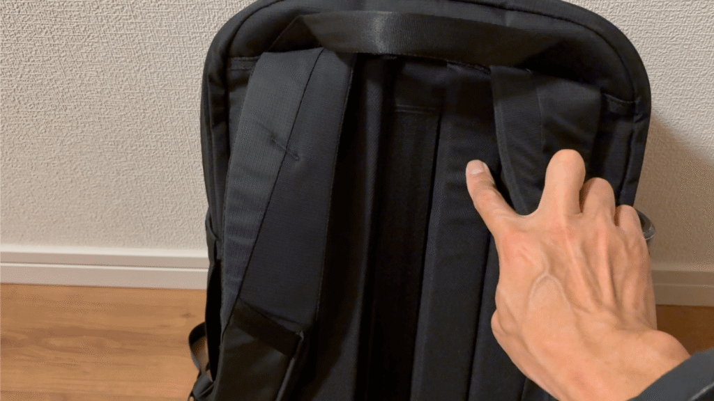 多くのリュックにある薄いハンドルとは異なり、しっかりとした厚みのあるハンドルが採用されています。手にした時の握りやすさは格別で、通勤途中で買い物をしたときなど、手で持つ機会が多い場面でその便利さを実感しました。