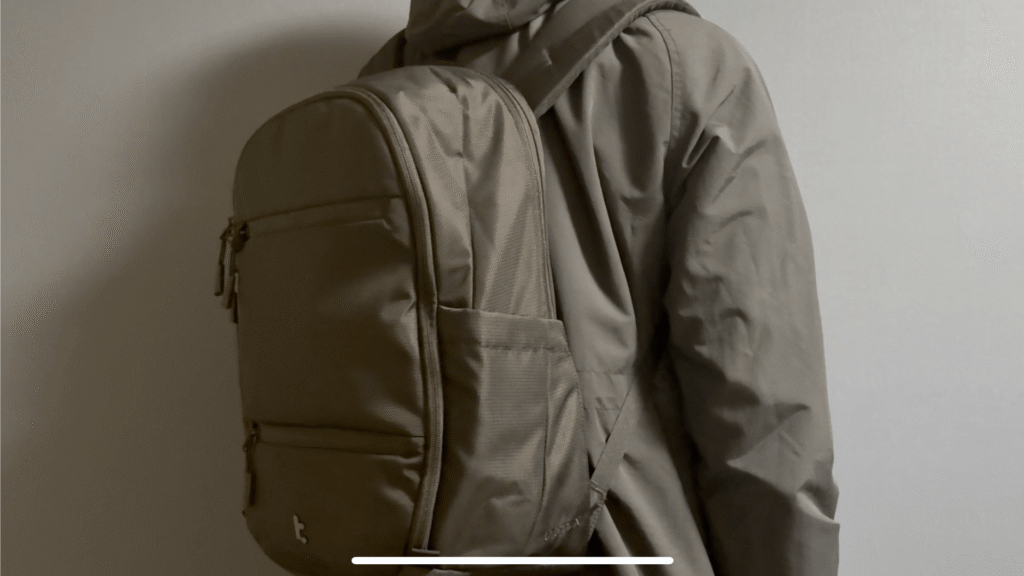 tomtoc T77は、ロゴが控えめで、余計なポーチやフックがむき出しになっていない、非常にシンプルで洗練されたデザインです。素材の質感も高く、ビジネスシーンにふさわしいスマートな印象を与えます。実際にスーツで持ち歩いても、カジュアルなリュックのようなちぐはぐ感はなく、むしろ機能美を感じさせる佇まいです。色も落ち着いたブラックやネイビーなどが用意されているため、様々なスーツのコーディネートにマッチします。機能性だけでなく、ビジネスツールとしての見た目も重視する方にこそ、ぜひ手に取っていただきたい一品です。