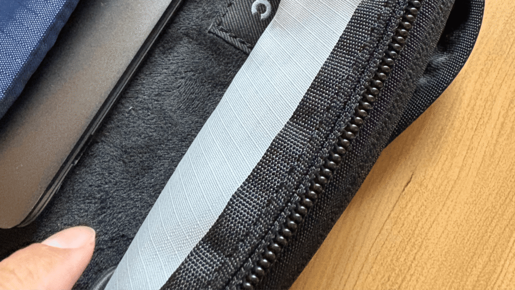 まず、前面ポケットの仕切りについては、もう少し細かく区分けがあると良いと感じました。現在の仕様でも小物は収納できますが、ペンや小さなガジェットなどを立たせて収納できる仕切りがあると、より整理しやすく感じると思う。