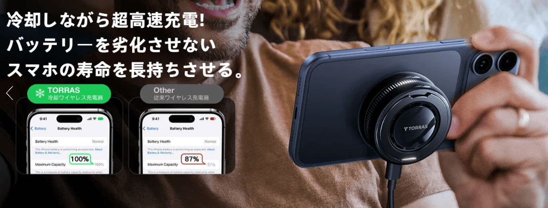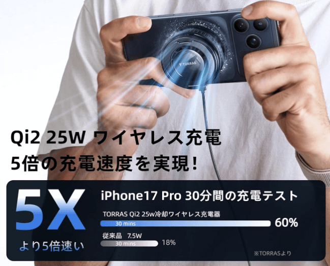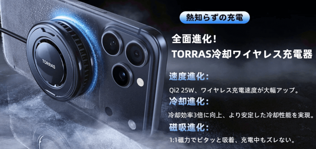 | TORRAS Qi2 25W | 25W | 60% | 圧倒的な速度と冷却機能 |