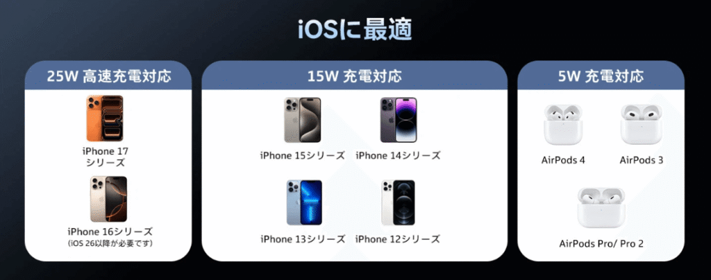 | 対応機種 | iPhone 17/16シリーズ、iPhone15/14/13/12シリーズ、Galaxy S24/25シリーズ、AirPods 4/3/Pro 2 |