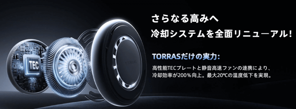 このシステムは、単なる冷却ファンに留まらず、「ペルチェ素子」と「冷却ファン」、そして前述の45W低温充電器と連携することで、充電の最初から最後まで、安定した低温状態を維持するという、冷却アプローチを採用しています。この複合的な冷却構造こそが、TORRAS独自の「PolarCircle」冷却システムの核となります。