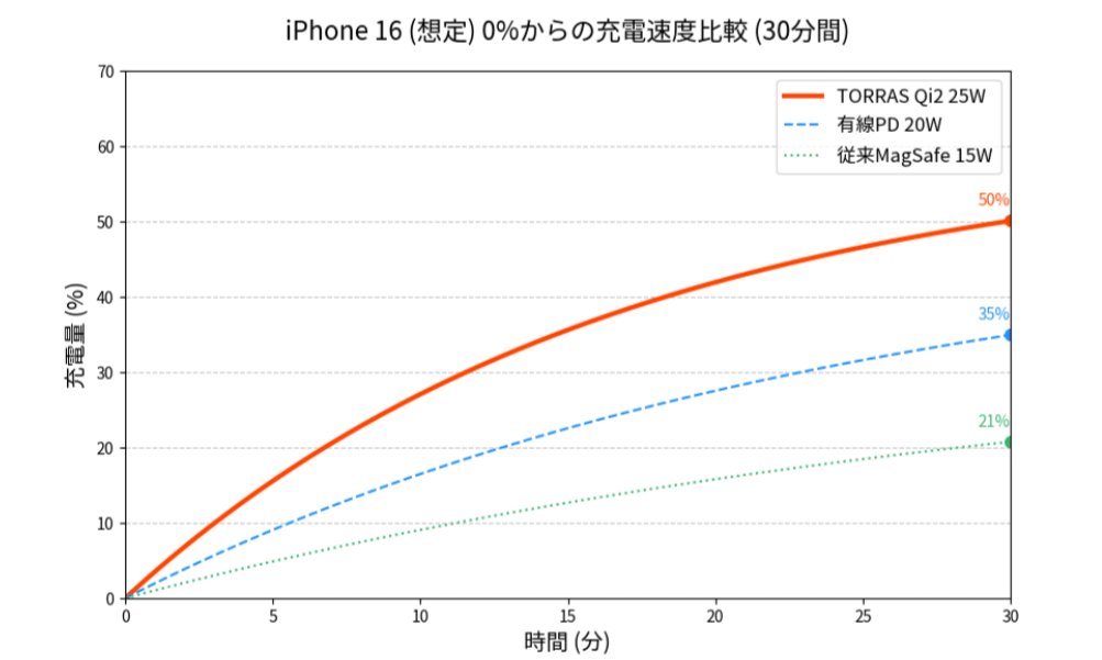 このデータから明らかなように、TORRAS MagSafe充電器は、従来のワイヤレス充電はもちろん、有線接続の20W PD充電をも凌駕するスピードを実現しています。