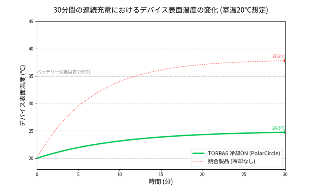 PolarCircle冷却システムの有効性を確認するため、30分間の連続充電におけるデバイス表面温度の変化をシミュレーションデータで比較します。