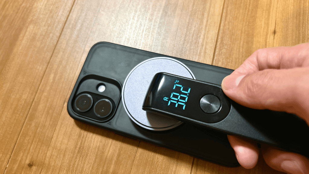 初めてスマートフォン(iPhone16)を充電器に近づけると、強力なマグネットが「カチッ」という心地よい音と共に、瞬時に最適な位置に吸着します。このマグネットの吸着力は非常に強力で、充電中に誤って触れても位置がずれる心配がありません。