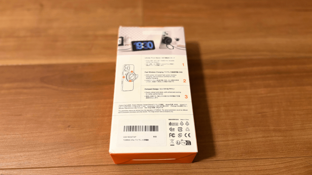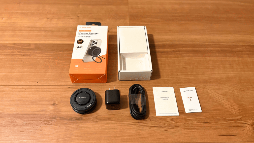 製品の性能を語る前に、まずはTORRAS MagSafe充電器のパッケージ内容を見ていきましょう。製品の箱を開けた瞬間、このメーカーがこの製品にかける「本気度」が伝わってきました。