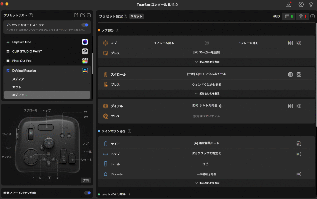 TourBox EliteがDaVinci Resolveと相性がよい理由は、ページごとに操作内容が変わる編集ソフトでも、プリセットを使って柔軟に切り替えられるからです 。