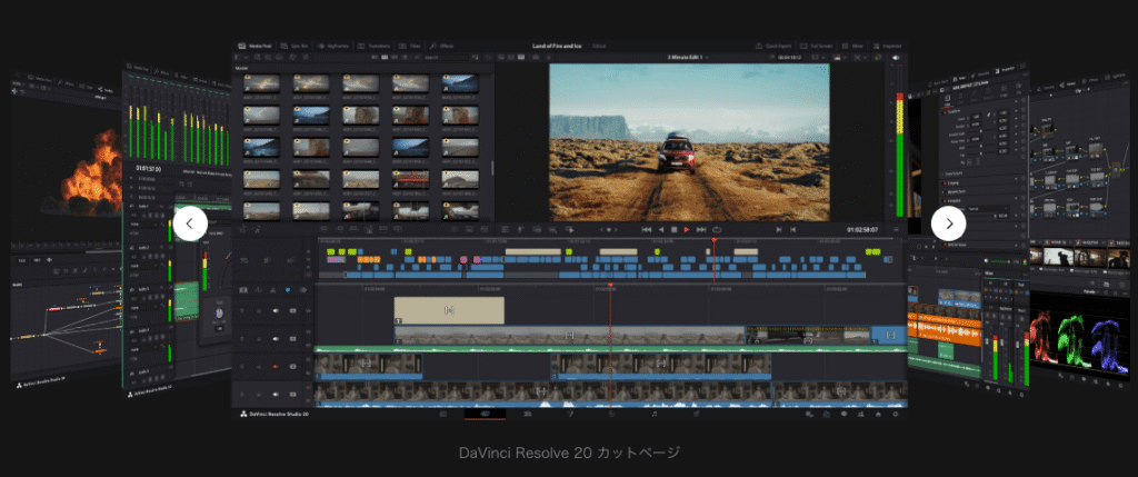 DaVinci Resolveは、メディア、カット、エディット、Fusion、カラー、Fairlight、デリバーの7ページで構成されています 。