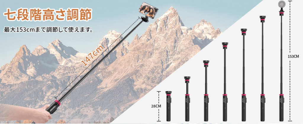 重量については、一般的な自撮り棒より重いものの、その分アルミニウム合金を使用した耐久性の高さと、高く伸ばした際の安定性を確保しています。また、磁気式固定はクリップ式に比べてスマホの取り付け・取り外しが格段に速く、撮影のチャンスを逃しにくいという実用的なメリットがあります。