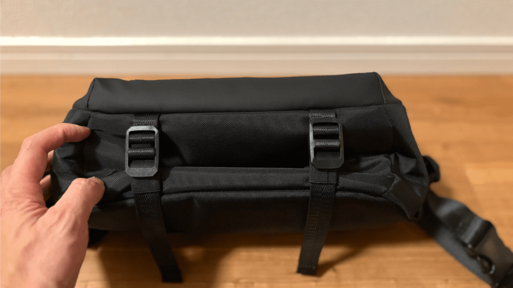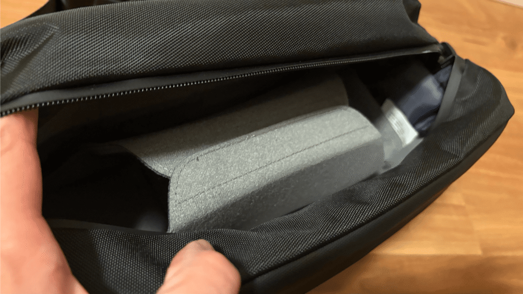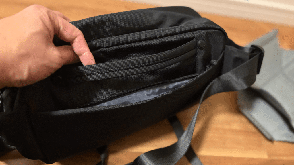 まず手に取って気づくのは、そのコンパクトなサイズ感です。外形は約30cm(幅)× 15cm(奥行き)× 22cm(高さ)。A4ファイルよりも少し背が高い程度で、体に密着させて携行するスリングバッグとしての使い勝手の良さが想像できました。