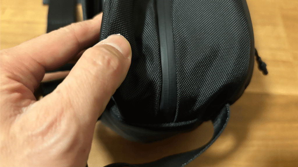 素材について特筆すべきは、全面的な撥水加工です。公式サイトや取扱説明でも「水しぶきからは保護するが、長時間の雨や水没には耐えられない」と注記されており、あくまで日常的な天候変化への備えという位置づけです。ファスナーも雨水の侵入を防ぐ設計ですが、嵐の中での使用は想定されていません。