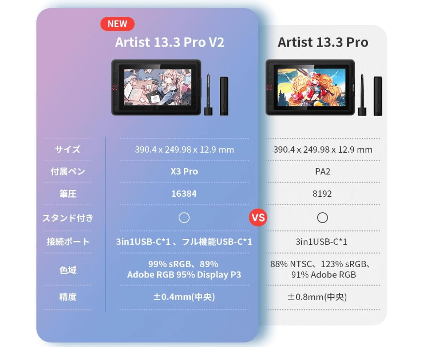 ここでは、Wacomの主要な競合モデルと比較することで、XP-Pen Artist 13.3 Pro V2の優位性を探ります。