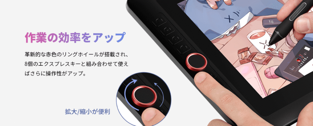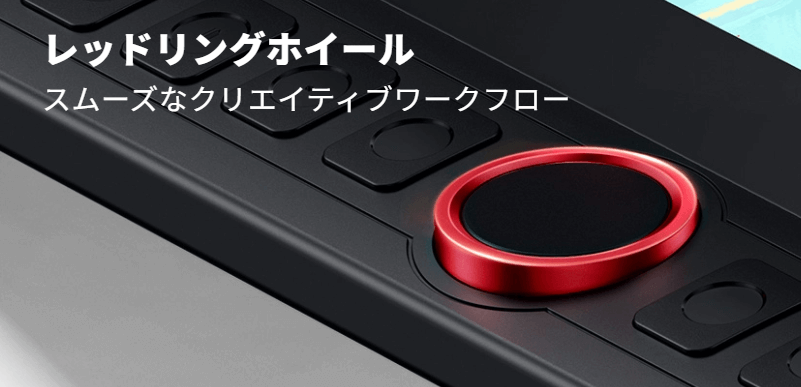 レッドリングホイールは、指で軽く回すだけで様々な操作を素早く行える、非常に便利な入力デバイスです。例えば、キャンバスの拡大・縮小、回転、ブラシサイズの調整、スクロール、さらにはシステムの音量調整など、頻繁に使う機能を割り当てることができます。