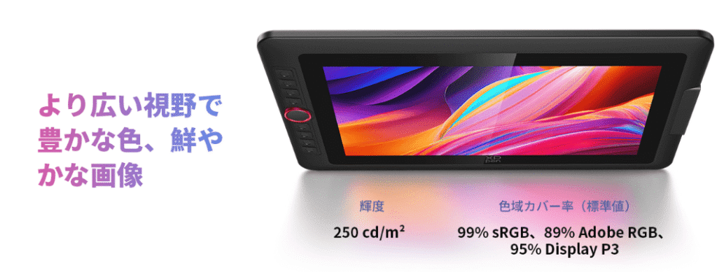 また、色域カバー率も重要です。sRGB、Adobe RGB、Display P3の範囲が広いほど、より正確で豊かな色彩表現が可能。XPPen Artist 13.3 Pro V2は99% sRGB、89% Adobe RGB、95% Display P3と、この価格帯では非常に優秀です。