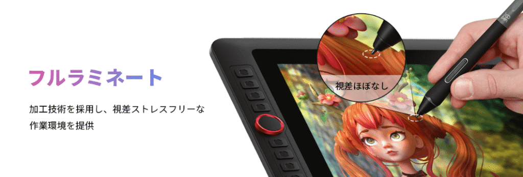 さらに、フルラミネーション技術により、液晶と保護ガラスの間の空気層をなくし、視差を最小限に抑制。まるで紙に描くような自然な描き心地を実現しています。反射防止フィルムも施され、映り込みを防いで集中を妨げません。
