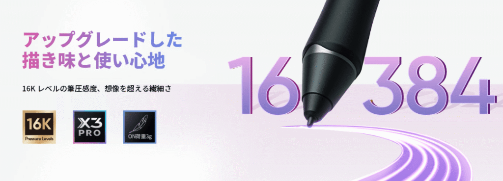 最大の特徴は、世界初の16384レベルの筆圧感知。従来の8192レベルの約2倍の精度で、繊細な筆致や微妙なタッチを忠実に再現します。