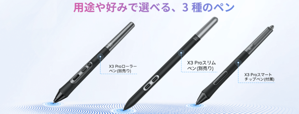 | スタイラス | X3 Proスマートチップスタイラス | Wacom One Pen | Wacom Pro Pen 3 |